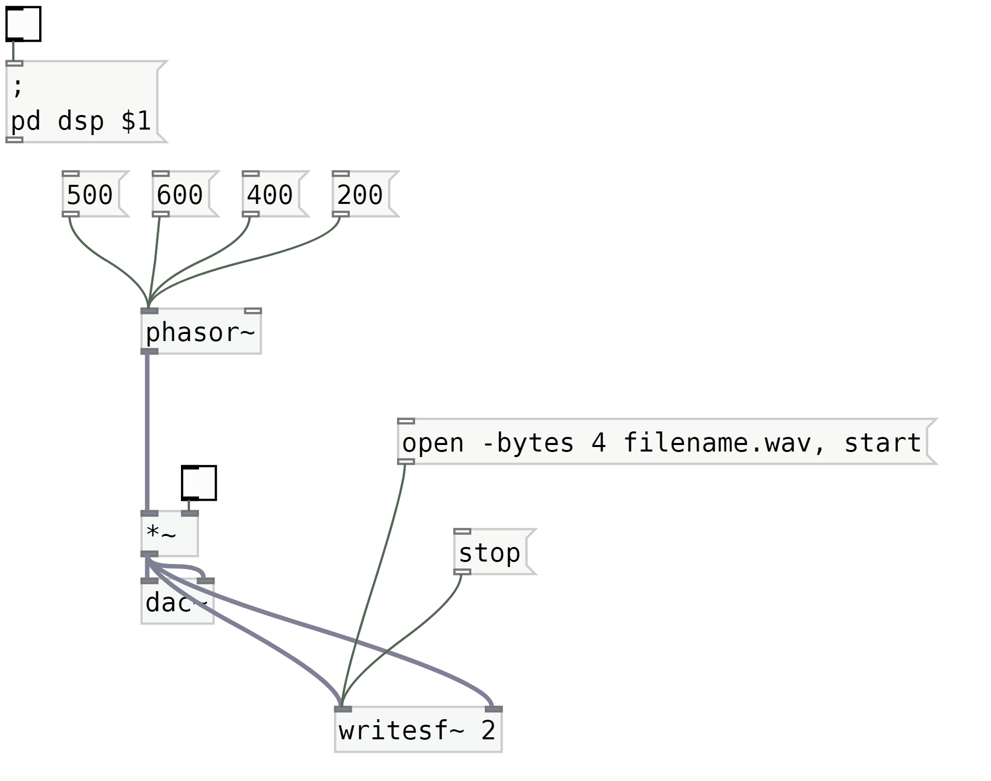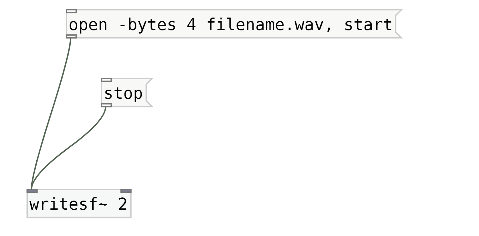 2. Add two messages open and stop to the first inlet (the furthest left) of [writesf~] Firstly, add a 2 behind or beside [writesf~], like this [writesf~ 2] (the two opens up two inlets on [writesf~ 2], allowing stereo recording). Add two messages open and stop to the inlet of [writesf~ 2] to begin the recording process. You must add additional lines to open to intialize the recording. In the message of open please type out open -bytes 4 filename.wav, start. This will generate a .wav file with the filename, filename.wav. What does bytes do? bytes 4 will create a 32-bit flaoating-point soundfile. You can add without bytes and another way is bytes 3, which creates a 24-bit soundfile.