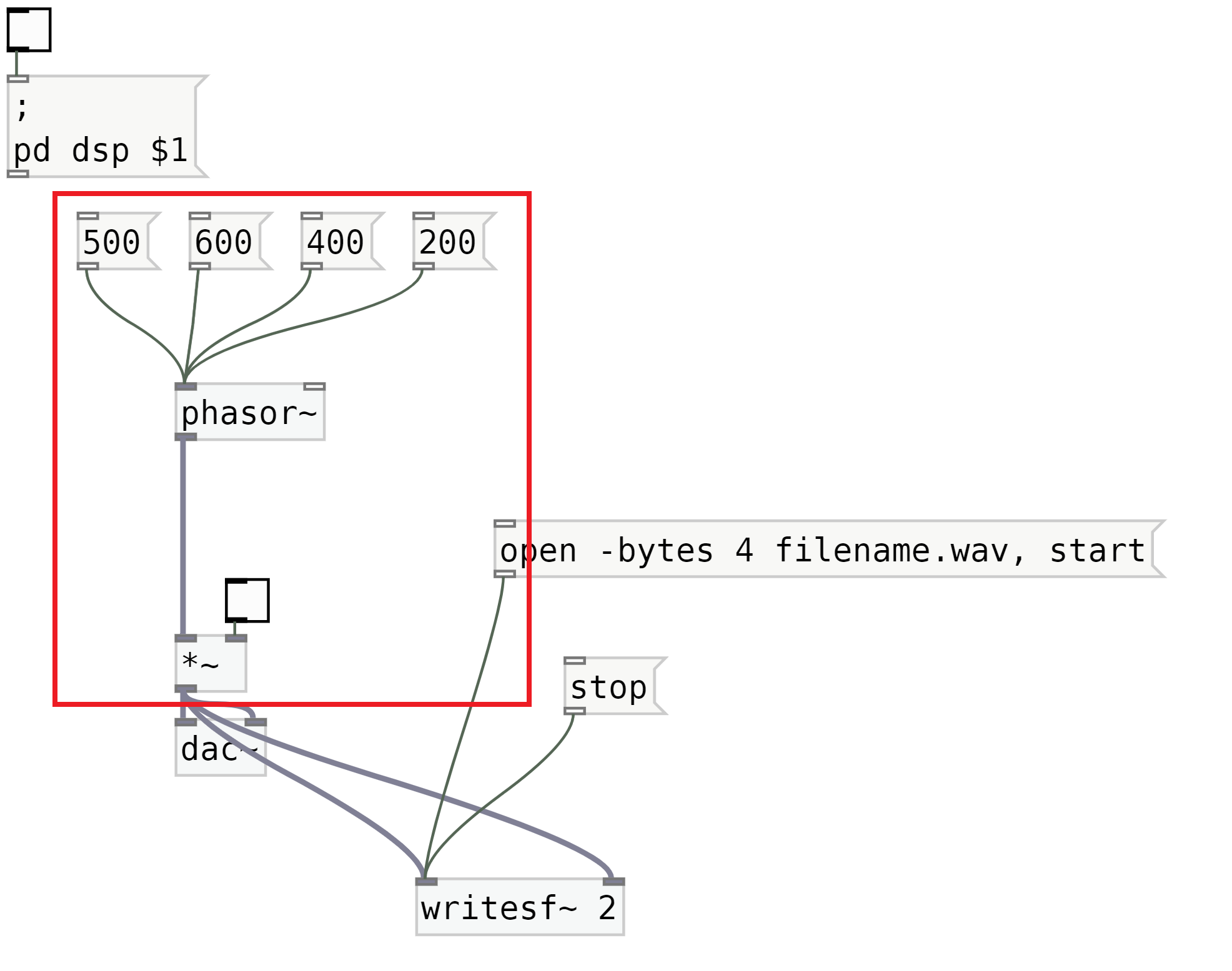 3. Firstly, add a 2 behind or beside [writesf~], like this [writesf~ 2] (the two opens up two inlets on [writesf~ 2], allowing stereo recording). Then connect the sound/audio generator outlets to both the inlets of [writesf~ 2]. Finally connect the sound/audio generator outlets to both the inlets of [writesf~ 2]. (CONNECTING BOTH creates a stereo track). In this image I have boxed out the section that generates sounds/audio/music. If you noticed at [*~] the outlet is connected to both of the [writesf~ 2] inlets.