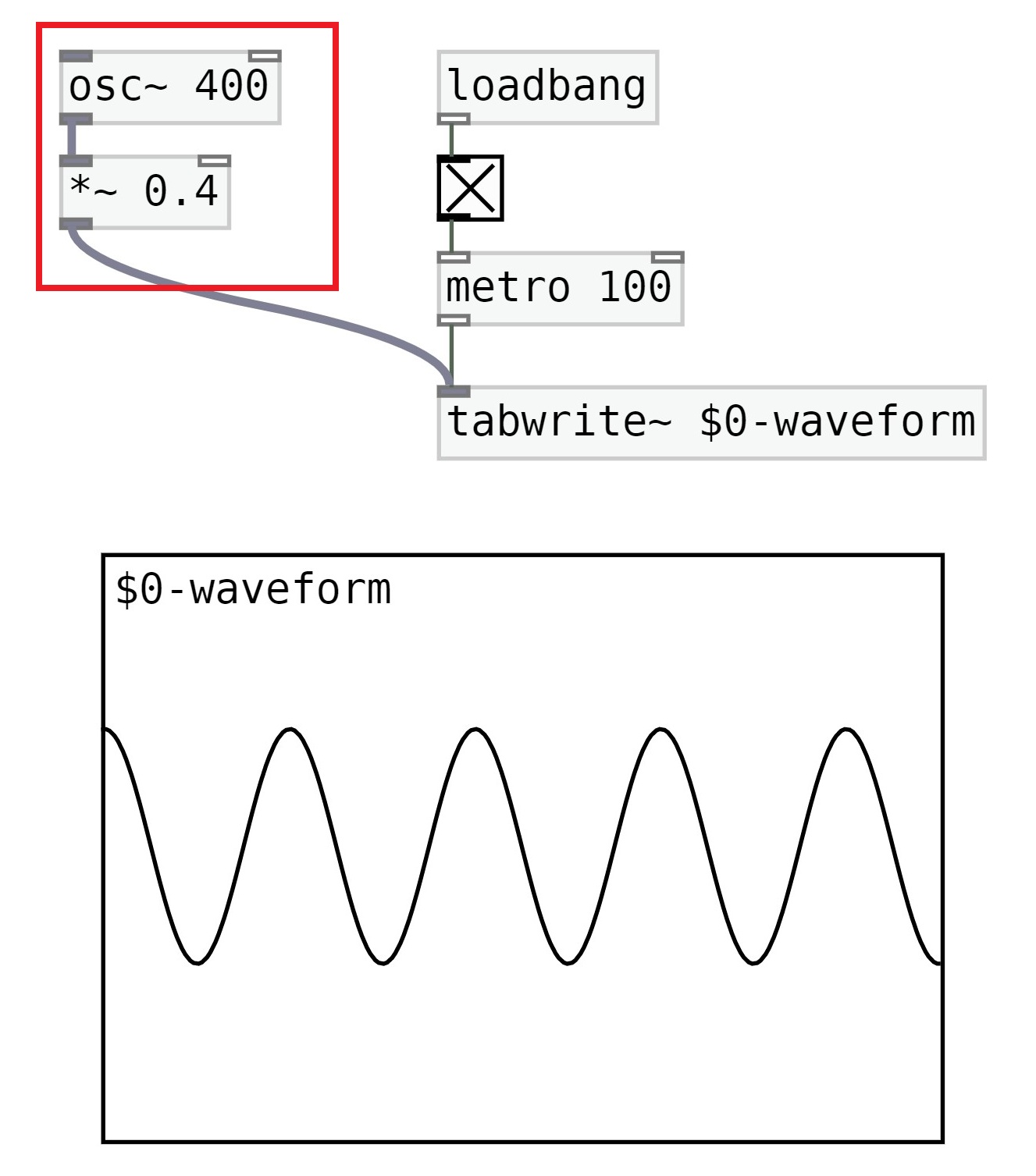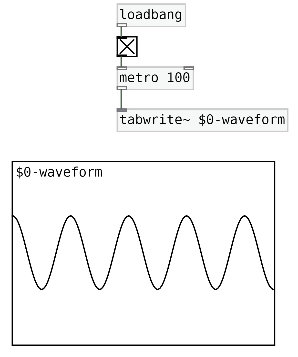 Add the [loadbang] object, and in its outlet connect a toggle. Make sure the toggle is X'd out so its turned on. The toggles outlet should be connected to a [metro]. We'll use [metro 100], 100 miliseconds is a reasonable amount to visual the generative sound in the oscilloscope. Make sure [metro 100]'s outlet is connected to [tabwrite~ $0-waveform]. The metro allows the visualisation or animation of the sound into the array object.